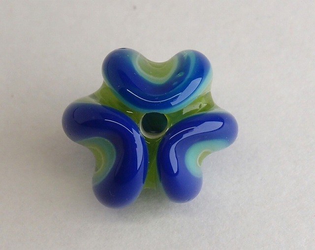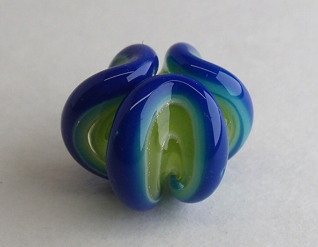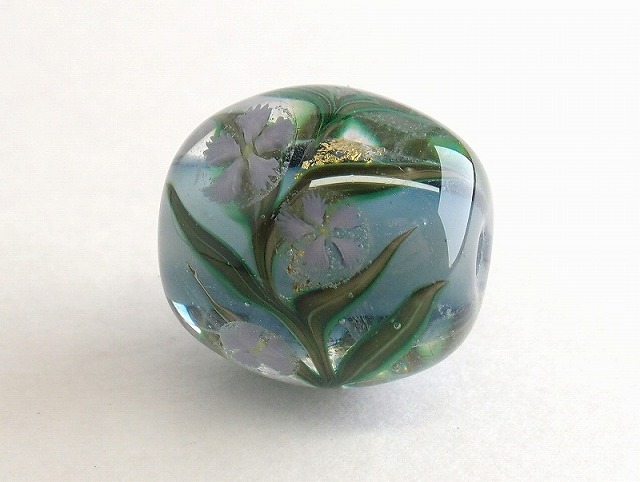 いつもは溶かしたガラスをコロコロしながら外形を丸く整えて行くのですが、この玉は全く違った作業工程で、うにょ~っとガラスを畳んでいくように形作っていきました。